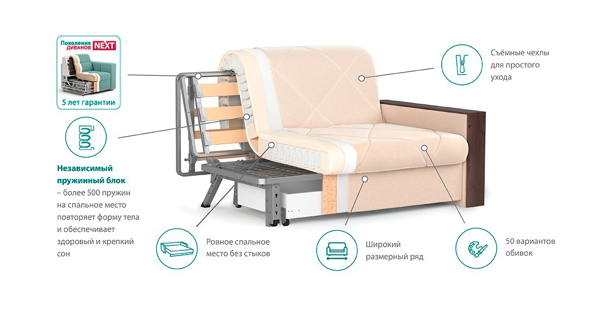 Особенностью диванов с механизмом Аккордеон является просторное и ровное спальное место, несмотря на компактные размеры дивана в собранном положении. А также возможность встроить вместительный бельевой ящик. В данном механизме исключается возникновение скрипа благодаря сиденью дивана, которое выполнено на металлической сетке. Каждая из трех секций спального места имеет по 4 твердые точки опоры, которые исключают вероятность скрипа. Уникальная конструкция позволяет фиксировать сиденье почти в вертикальном положении, что обеспечивает самый комфортный доступ к бельевому ящику.