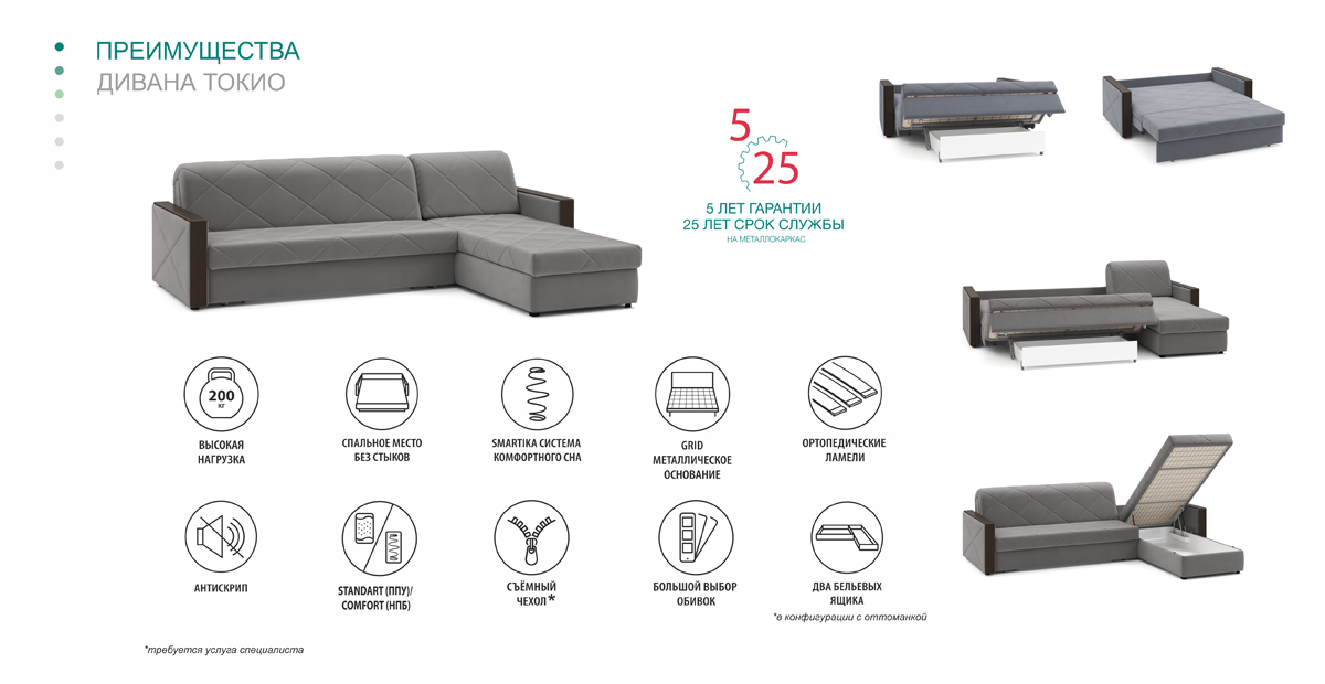 Угловой диван Токио NEXT отражает стремление японцев к простоте и практичности. Это прекрасный вариант для тех, кто использует диван как кровать для повседневного сна. Благодаря механизму Аккордеон при раскладывании образуется удобное спальное место без стыков, а наличие фальшспинки убережет покрытие стен от царапин и потертостей. Чехол дивана Токио наполнен мягким холлконом и простеган, чтобы в процессе использования обивка не сминалась и не растягивалась. В случае загрязнения чехол можно снять для чистки или замены.